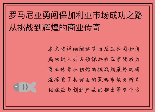 本文将详细阐述罗马尼亚公司如何成功进入并占领保加利亚市场,成为商业传奇。从初始的挑战到最终的辉煌,探索了其背后的策略、市场分析、文化适应与创新产品的推出等多个方面。文章将重点分析罗马尼亚企业如何应对保...