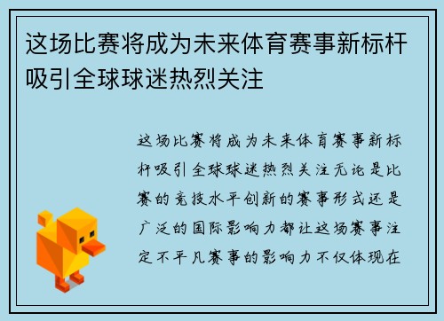 这场比赛将成为未来体育赛事新标杆吸引全球球迷热烈关注