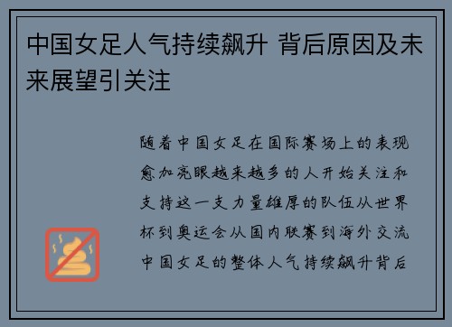 随着中国女足在国际赛场上的表现愈加亮眼,越来越多的人开始关注和支持这一支力量雄厚的队伍。从世界杯到奥运会,从国内联赛到海外交流,中国女足的整体人气持续飙升,背后的原因值得深思。本文将从四个方面深入探讨...