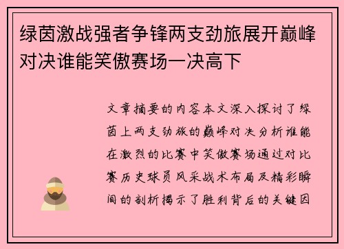 文章摘要的内容:本文深入探讨了绿茵上两支劲旅的巅峰对决,分析谁能在激烈的比赛中笑傲赛场。通过对比赛历史、球员风采、战术布局及精彩瞬间的剖析,揭示了胜利背后的关键因素。1、历史对决绿茵上的两支劲旅,究竟在过去的对决中谁更胜一筹?历史上的经典对...