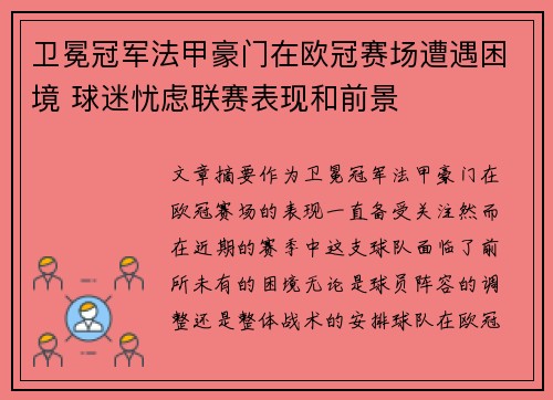 卫冕冠军法甲豪门在欧冠赛场遭遇困境 球迷忧虑联赛表现和前景