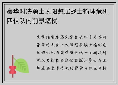 文章摘要: 本篇文章将从四个方面对“豪华对决勇士太阳憋屈战士输球危机四伏队内前景堪忧”这一主题进行深入分析。首先,我们将探讨勇士与太阳这场豪华对决的背景与焦点,分析两队的实力对比以及比赛中的关键因素。接着,文章将转向勇士队的现状,重点分析其...