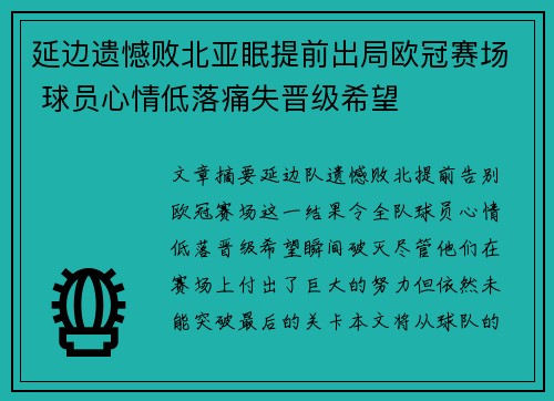 文章摘要:延边队遗憾败北,提前告别欧冠赛场,这一结果令全队球员心情低落,晋级希望瞬间破灭。尽管他们在赛场上付出了巨大的努力,但依然未能突破最后的关卡。本文将从球队的士气问题、战术失误、球员的个人表现、以及对未来的影响等四个方面详细分析延边队...